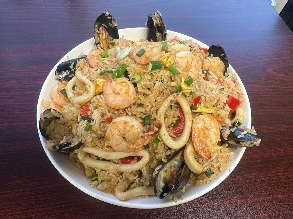 Arroz frito con mariscos mezclado con cebollín, pimiento rojo y huevo picado. Salteado al wok con salsa de soja y salsa de ostras. / Seafood fried rice mixed with scallions, red bell peppers and chopped egg. Sautéed in a wok with soy sauce and oyster sauce.