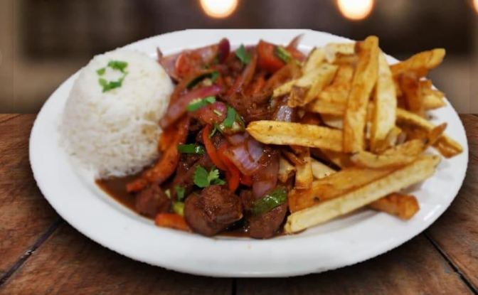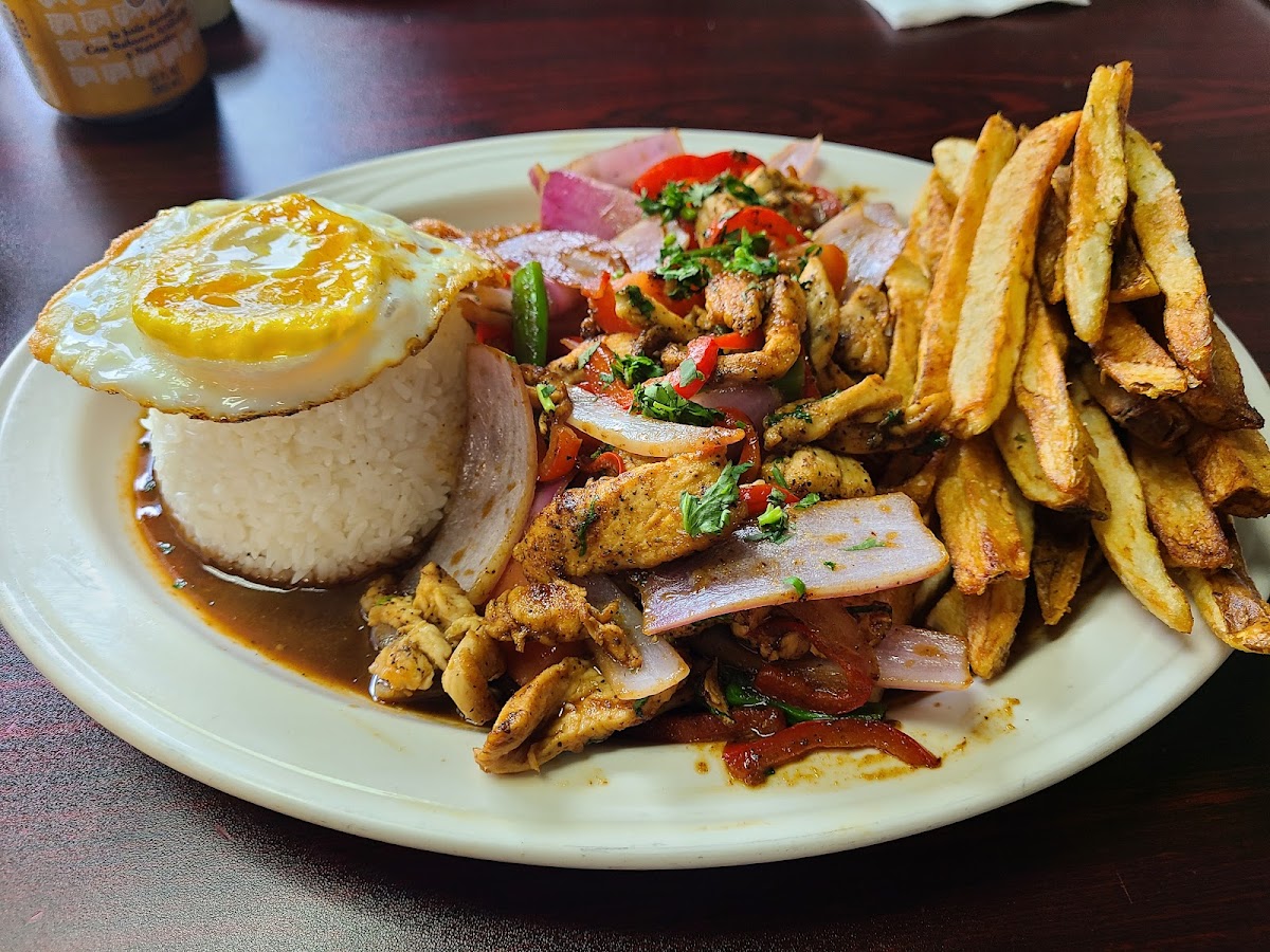 Pollo salteado con salsa de soya, toque de salsa de ostión, cebolla, tomate, cebollín con ají amarillo, pimiento rojo y cilantro. Servido con papas fritas y arroz blanco al lado. / Chicken stir-fried with soy sauce, touch oyster sauce, onions, tomatoes, aji amarillo scallions, red peppers, and cilantro. Served with French fries and white rice on the side.