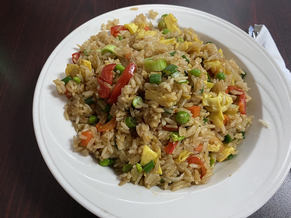 Arroz frito mezclado con guisantes, cebollín, pimiento rojo y huevo picado. Salteado al wok con salsa de soja y salsa de ostras. / Fried rice mixed with green peas, scallions, red bell peppers, and chopped egg. Sautéed in a wok with soy sauce and oyster sauce.